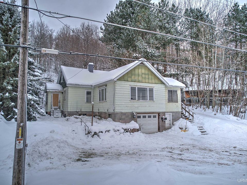 Franklin Township home with Portage Canal views and easy access to Hancock/Houghton. This 1 1/2 story layout offers two main floor bedrooms with adjacent full bathroom, a spacious living room, dining room with hardwood floors, functional kitchen and a front porch/entry area for boots and gear. Upstairs offers a third bedroom. The basement offers a drive under garage, laundry area, and additional space including a sauna with a shower. Situated on 0.34 of an acre lot with 150 feet of road frontage, the property offers ample parking and includes a large shed. This township location is across from the snowmobile/ORV trail and a power-sports location, which offers snowmobile and boat rentals that makes this an excellent all-season home base or rental opportunity. Nice option for a year-round home, MTU housing or Keweenaw getaway.