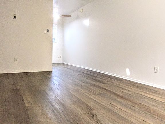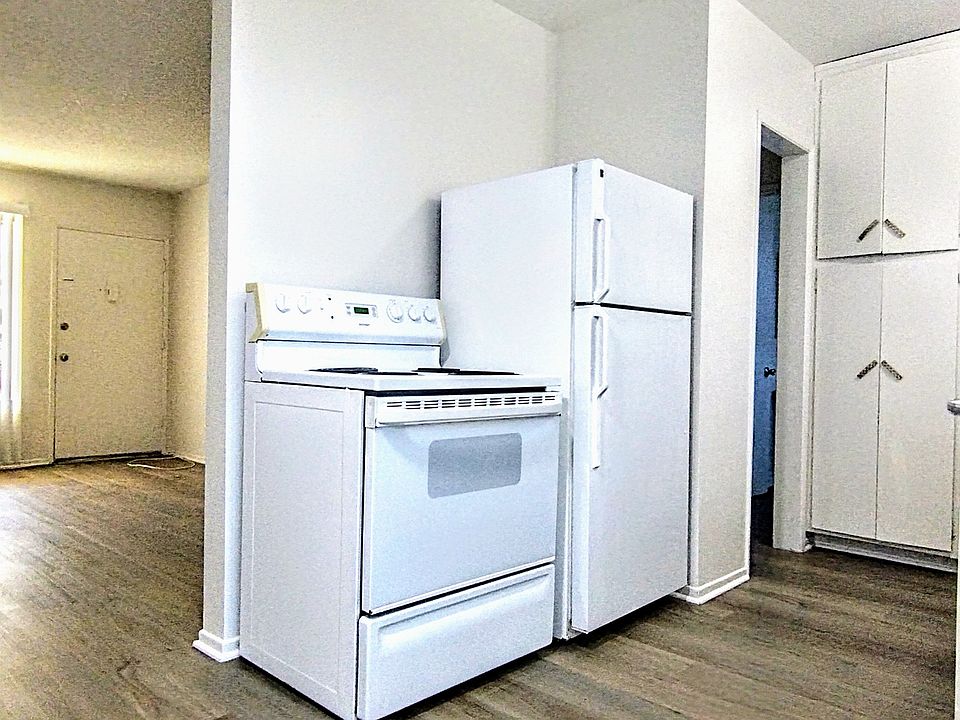 The apartment is a 1st floor apartment with hardwood floors, refrigerator, stove, new ceiling fans, garage parking, and coin op. laundry room on the premises.