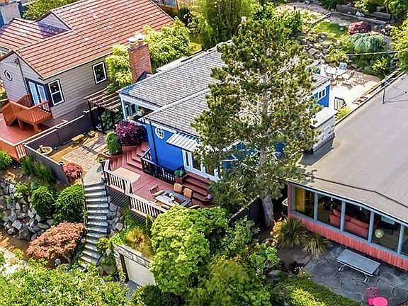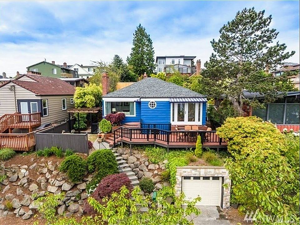 Updated Cape Cod w/ stunning day & night views of Seattle skyline, Rainier & Queen Anne! Elegant living room w/ large bay window & sculptured fireplace, dining rm French doors open to spacious view wrap-around lounging deck, master suite, lwr level w/ bath, bdrm, livg room, plumbed kitchenette perfect for AirBnB income. Generous, charming terraced rear yd, go up a story for even more amazing views! 15 min bike ride to dntwn!