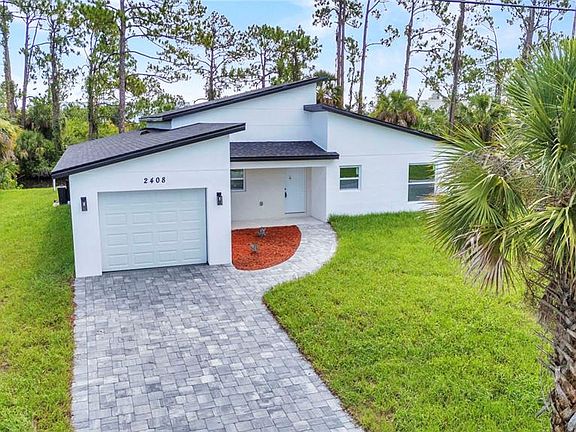 Waterfront brand new 4-bedroom, 2-bathroom contemporary modern home is ready for you to move in and enjoy. Built with quality and comfort in mind, it features tile flooring throughout, high level quartz countertops, stainless steel appliances, and hurricane impact windows for peace of mind. The open kitchen and living area offer a clean, modern feel with plenty of natural light. The primary suite includes a tiled walk-in shower, soaking tub, and a large walk-in closet. The second bathroom is also fully tiled and easy to maintain. All ceiling fans and lighting fixtures are installed, so there's nothing left to do but move in. Outside, you'll find a pavered driveway and simple, modern curb appeal. Located just minutes from shopping, restaurants, and with quick access to the highway. You're also a short drive from beautiful beaches and popular amusement parks