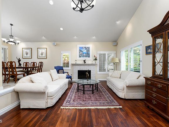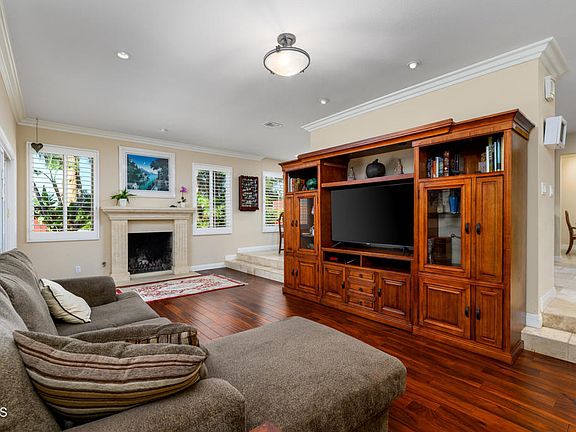 Nestled north of Las Posas in a picture-perfect setting, this fabulous Rancho Tomas residence is just steps from the Charter Oak walking trail -- lined with eucalyptus trees leading to a sweet community park. From the moment you arrive, you'll feel the home's sense of refinement. Beautiful stonework, arches, and a charming fountain frame the entry, while a stunning wrought-iron arched front door welcomes you inside. Step into soaring ceilings and sun-filled living spaces designed for both comfort and style. Two inviting stone fireplaces anchor the formal living and family rooms, complemented by travertine tile and rich hardwood flooring that flow seamlessly throughout.Complete with GE Monogram stainless-steel appliances - double ovens, five-burner gas cooktop; a Bosch dishwasher, pull-outs on every lower cabinet, under-cabinet lighting and a wine storage area. Enjoy casual meals in the eat-in area or host elegant dinners in the formal dining room enhanced by crown moulding and plantation shutters, which are carried through the home.The flexible floorplan includes a double-door office or downstairs bedroom with a walk-in closet and a full bath nearby -- ideal for guests or multi-generational living. Upstairs, the expansive primary suite offers a peaceful retreat with a generous walk-in closet, double copper sinks, and a luxurious walk-in shower. Two additional bedrooms each feature abundant space with walk-in closets and hillside views! The guest bath offers double sinks and a separate shower over tub; across the hall is a perfectly placed linen/storage closet - also a walk-in!Outdoors, your private oasis awaits -- a resort-style backyard with a heated pool & spa, outdoor kitchen, two covered patios w/built-in heaters, a sundeck, raised garden beds, tropical landscaping - including a lemon tree, and more storage! Enjoy the gentle breeze and the soothing scent of eucalyptus from the trail that borders the property.Additional highlights include newer HVAC, a spacious three-car garage, retractable-electric pool cover, indoor laundry, and low-maintenance paver walkways and yards with turf. Every detail reflects pride of ownership and thoughtful craftsmanship -- creating a home that is as beautiful as it is functional.Lastly, it's just a short distance to the Camarillo Village Square, which offers several dining & shopping options. Discover the rare combination of luxury, privacy, convenience and natural beauty that makes this home truly exceptional.