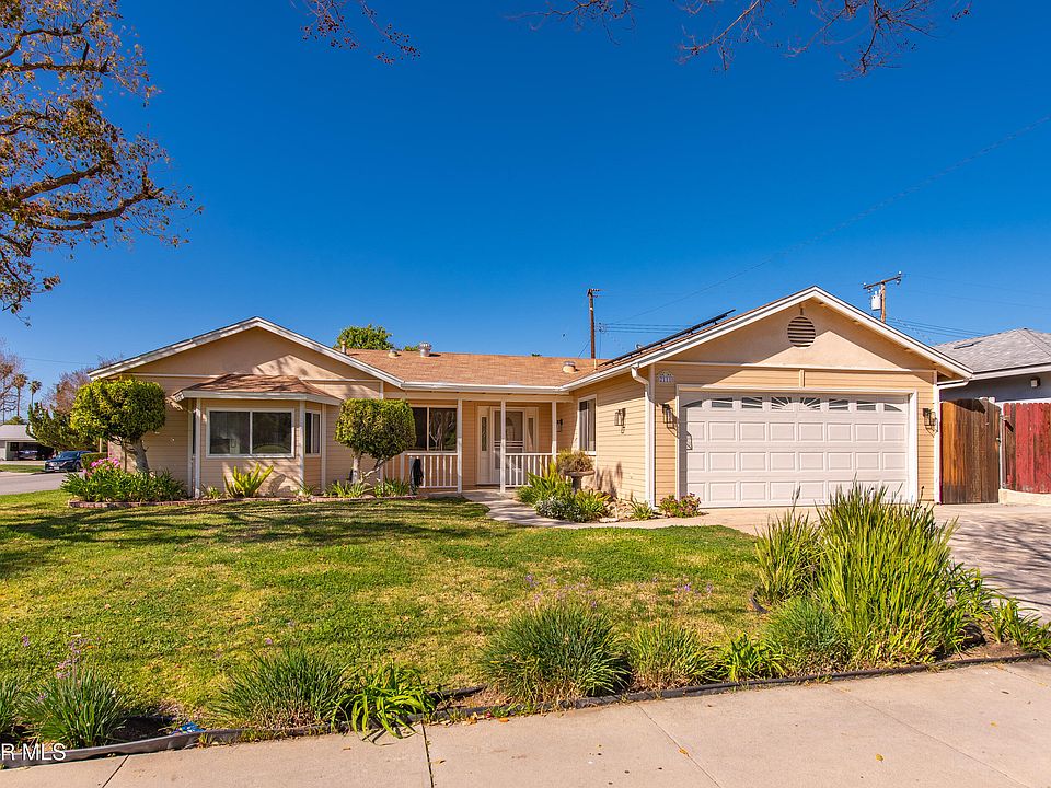 Beautiful remodeled single story home nestled in Central Simi. As you walk to your front door you are welcomed with a porch area to look out at the mountain views. This home boasts 4 bedrooms and 2 bathrooms. Laminate floors throughout. Kitchen is equipped with quartz countertops, tile backsplash, and stainless steel appliances. Guest bathroom has a tile shower with a glass door. Master en-suite with dual vanities, quartz counter tops, and a tile shower with a glass door. The backyard has a concrete patio, grass area, and a shed for storage.