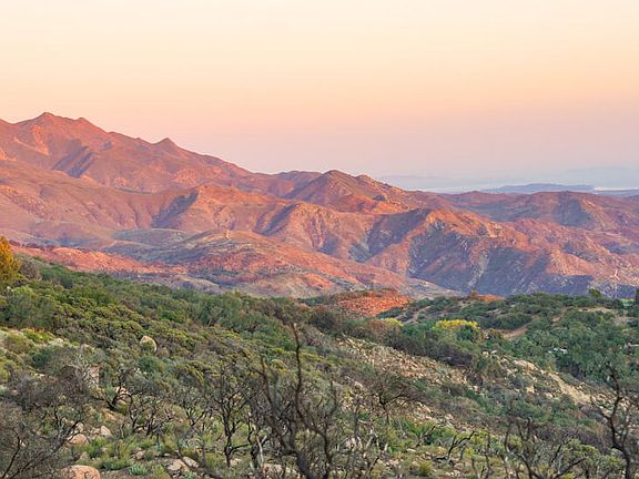 The property is comprised of multiple structures including a rustic mountain home, two large greenhouses, and a cabin with panoramic ocean views, in a microclimate that is perfect for growing grapes, citrus and stone fruit.