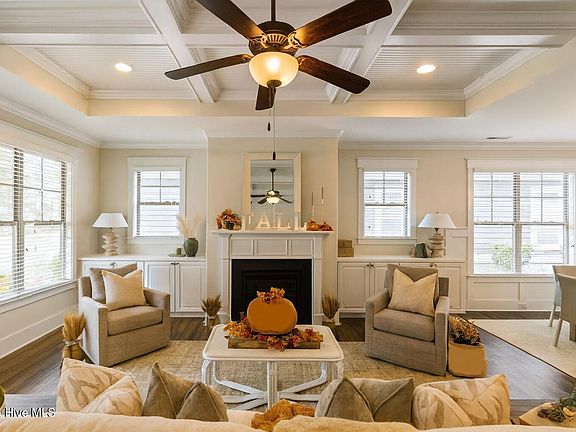 Back on Market! Welcome to your dream home in the desirable Shelmore neighborhood of Brunswick Forest, Leland. This 4-bedroom, 3-bathroom home offers an open layout with elegant touches including coffered ceilings, a cozy fireplace, wainscoting, and a gourmet kitchen featuring brand-new granite countertops. The home has been recently updated with new lighting features, sleek epoxy garage floors, and more! The first-floor master suite features a walk-in closet and a luxurious bathroom.