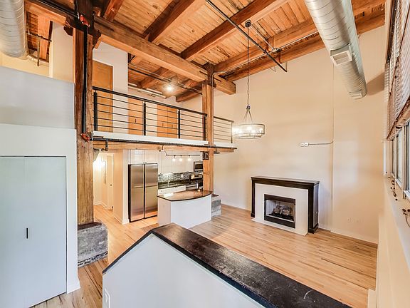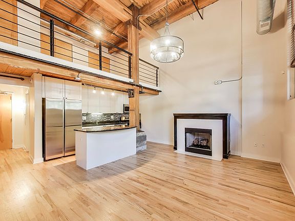 This fantastic two level loft is the larger one bedroom floor plan in the building which includes five closets. Located in the historic Churchill Row Lofts building on a quiet tree-lined street with luxury single family homes in the heart of Bucktown/Wicker. Just off the 606 Trail and very close to the bustling Damen & Milwaukee Corridors, night life, shopping & Blue Line. Enjoy the rustic and inviting charm of a true Chicago loft with its soaring 17' timber ceiling, exposed wood beams & columns, ductwork, hardwood floors and a gas fireplace. The spacious bathroom was updated in 2023. The large lofted bedroom with three customized closets overlooks the living room with views to the outside through a full wall of 13' tall windows which allows the sun in winter months and shade in the summer. The kitchen includes granite counters, SS appliances, solid wood white cabinetry, tiled backsplash and a three seat island. Access this unit through your own convenient gated and secured private patio entrance, through the garage or main lobby. New furnace in 2022. New in-unit washer/dryer and microwave 2023. New refrigerator 2025. Deeded indoor parking space and ample street parking. Storage locker also included! The architectural details make this property one you won't forget!