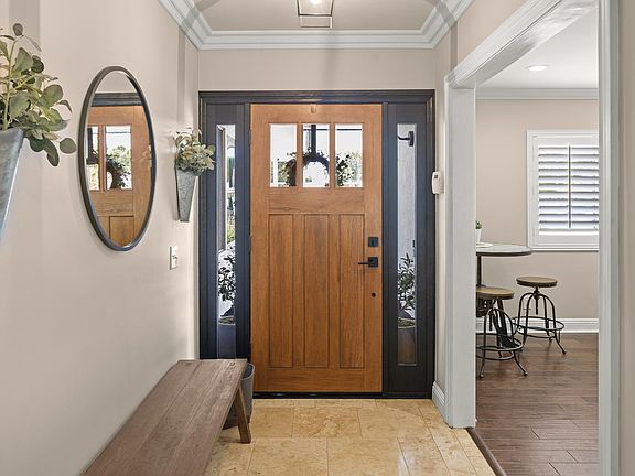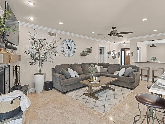 As you approach this charming 3 bed, 2 bath home nestled in a quiet, friendly neighborhood, you're captivated by its striking curb appeal. A private, large gated driveway and 2 car garage offer ample parking, framed by sharp landscaping leading to the front door of this newly remodeled home. Stepping inside, the decorator's eye for detail is evident throughout, as you're greeted by a bright, elegant space adorned with crown molding and travertine floors. The main living area boasts a cozy fireplace seamlessly merging with a white, bright kitchen featuring quartz countertops and expansive cabinetry. Further exploration reveals a separate laundry room with pantry and an additional spacious living area, currently a billiards room, perfect for entertaining. Down the hallway, the batten board accented walls continue into the stunning primary bedroom and a well-designed en suite with soaking tub, shower, and dual vanity, offering both luxury and functionality. Two additional bedrooms await, along with a chic remodeled bathroom including a door allowing convenient access to the yard for entertaining and pool days. Sliding glass doors from the living area open to the entertainer's backyard, complete with an outdoor grilling area with BBQ and fridge under a brand-new patio cover. Imagine hosting gatherings with the sound of water flowing into the refreshing pool and spa, complemented by a large cabana with a built-in gas fire pit. Relax in the sun, knowing this private oasis is powered by solar panels fully paid for, along with a new AC system, ensuring comfort year-round. Every detail has been carefully considered to create a space where luxury meets comfort, relaxation meets entertainment. Don't miss your chance to make this dream home yours today.