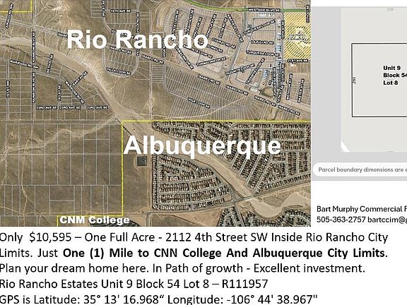 Use your telephone! Call for information!! One Full Acre in Rio Rancho less than One Mile to CNM College and Albuquerque City Limits. Close to new development, Plan your dream home or investment here. Call Today. Thank you.GPS is Latitude: 35 13' 16.968''Longitude: -106 44' 38.967''
