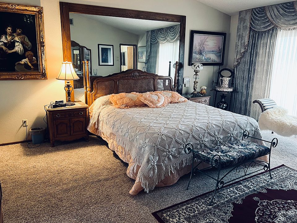 Bedroom 1: Features a spacious Master Suite bedroom with a king-sized bed, solid oak Thomasville furniture, and a 3-mirrored-door closet. The bathroom features an oval tub and bidet.