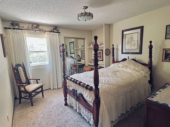 Bedroom 2: Features a single twin bed, small desk and dresser, and mirrored closet.