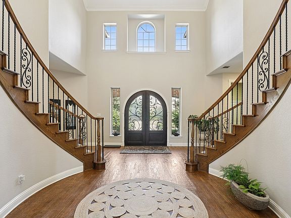 Paradise awaits with this gorgeous spacious home in Carroll ISD. This home offers hardwood handscaped floors with a breath-taking dual wood and iron staircase. Iron double front doors which creates a grand open entrance, heavy duty and beautiful. Downstairs features a very open and bright oversized living space with a warm kitchen with large pantry for maximum storage. As well as, primary bedroom with large en-suite bathroom with jetted tub and large shower. Ample counter space with large linen closet and oversized master closet. Also, there is a full spacious secondary bedroom with en-suite full bathroom for your guests downstairs as well. Kitchen is very spacious with eat in bar, as well as, formal and informal dining spaces within sight. Very open, very bright. Den is also opened to kitchen and formal dining room. Large bright living room has stunning pool views and access to built in bar. Gazebo with swing and plenty of outdoor seating makes this house perfect for entertaining. The pool is a wonderful place to watch the sunrise or set and has ample privacy with tall trees and mature landscape. House has large picture windows along with plantation shutters throughout. Main spacious office is located downstairs with custom built in cabinets and extra closet for storage. Mudroom and laundry room are very spacious and are connected to both garages. Plenty of parking with long finished driveway and four car epoxied garage (two to each side of the house) with Tesla EV charger already installed. Upstairs you will find 2 additional bedrooms with oversized Jack and Jill bathrooms, study nook, media room, and large game room with plenty of space for entertaining. Game room includes built in cabinets with mini fridge. Media room has screen mounted and ready for use. Lastly, there is an additional guest bedroom upstairs with adjacent full bath and large closet. This home is perfect for having family visit for the holidays.