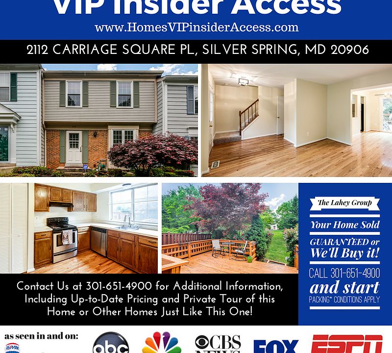 Buy this awesome home with $0 Down and up to 2 months with no payments to those who qualify, find out more call Jonathan Lahey directly at 301-651-4900. ************************************************************** For current pricing, private viewings or insider property detail reports on ANY home you see for sale in the area call Jonathan Lahey at 301-651-4900. *************************************************************** **Beautiful townhouse with 4 bedrooms and 3.5 baths **Fully finished basement with Spacious deck **Walking distance from restaurants, markets and gyms in both Layhill Shopping Center and Plaza Del Mercado **Great amenities such as pool, bike trails and Tot lot/playground. Adjacent to Argyle Country Club *************************************************************** YOUR HOME SOLD GUARANTEED OR I’LL BUY IT!* To discuss the sale of your home call Jonathan Lahey at 301-651-4900. *Seller and Agent must agree on price and possession at time of listing. **Property advertised may not be listed for sale and may be a representation of properties available now or in the future. Call for details. For a Free List of homes for sale matching your exact home buying criteria from ALL real estate companies, including distress sales, bank foreclosures and company owned homes call Jonathan Lahey at 301-651-4900.