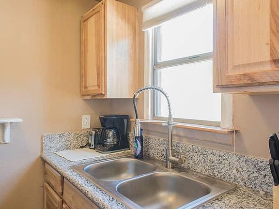 Updated kitchen and bathroom, with wood floors and vaulted ceilings. Air conditioned. Full kitchen with granite countertops and stainless steel appliances, including a gas stove, refrigerator, microwave, and dishwasher.