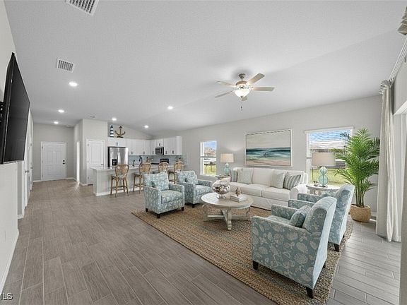 2022-built FGBC Green Certified home on a triple lot! Featuring 4 bedrooms, 2 bathrooms, and 3 car garage. There's room for everyone, or you can easily use a bedroom as a home office, playroom, or guest suite. The fenced-in oversized lot with gates is ideal for boat storage, a future pool, or transforming the large yard into your outdoor oasis! At the heart of the home is the kitchen featuring upgraded 36” painted cabinets, elegant quartz countertops, and stainless-steel appliances. The expansive counter space and bar top seating for up to 4-5 people! The kitchen flows seamlessly into the great room, where soaring 10-foot ceilings and abundant natural light create an inviting atmosphere. The master suite serves as a private retreat with a spacious walk-in closet and a luxurious master bathroom complete with a walk-in shower and dual vanities. Wood-look ceramic plank flooring. Tile throughout - No Carpet! Step outside to a covered lanai overlooking the oversized, fully fenced backyard with dual entry gates for easy access and added convenience. This private outdoor space is perfect for relaxing, entertaining, or planning your future pool. Premium upgrades include a whole-house water filtration system, a generator transfer switch (great for when there is a power outage!), hurricane-rated screens and fabric panels, rain gutters, an irrigation system, and a utility room with extra storage and laundry space. The 3 garage offers plenty of room for vehicles, boats, or storage. With all the upgrades included, this home is in like-new condition but a much better value - think of the tens of thousands you would have to spend to get all that comes with this house! Located in one of Cape Coral’s fastest-growing areas, this home is minutes from exciting future developments. The upcoming Cape Coral Grove, a 131-acre mixed-use town center, will feature upscale retail, dining, hotels, public parks, and community events projected to generate over $1.3 billion in economic impact. The anticipated Seven Islands Project will bring restaurants, boutique shops, marinas, green spaces, and possibly even a beach area, creating a premier waterfront destination. Also The Cove at 47th, the Bimini Basin Project, and Slipaway Marina, offering waterfront dining, boutique shopping, boat slips, nightlife, and entertainment. The reimagined Cape Coral Yacht Club. This location also provides quick access to shopping, dining, top-rated schools, and parks. A quick drive takes you to Fort Myers, pristine beaches, and Golfers will be near Palmetto Pines Country Club & Coral Oaks Golf Course.