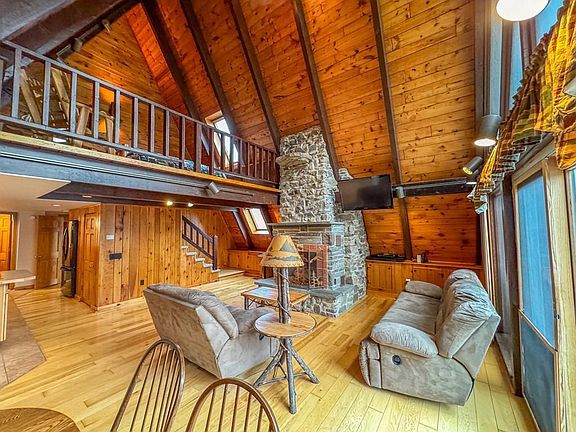 BEAUTIFUL MOUNTAIN HOME with views situated on 15 acres of land. Unique A-frame, 2 bedrooms and 2 baths, takes your breath away. Peace and serenity in the endless mountains ideal for home, vacation, relaxation. Floor to ceiling windows with gorgeous mountain view. Step outside to large deck that spans the entire front of the home. Primary bedroom has French doors to a small deck with a gazebo footsteps away. Bathroom has steam shower with beautiful tile and stone detail. Vaulted ceilings with impressive stone fireplace in main living room with open concept for entertaining. Balcony loft with gorgeous view for additional sleeping, sitting area, or office. Second bedroom boasts stunning views of the 15-acre retreat. Additional features – additional living room with 2nd fireplace, swim spa with skylights and sliding doors to back patio, custom built treehouse, spacious 3-car garage/enormous second floor, additional 2 car garage - perfect for car enthusiasts.