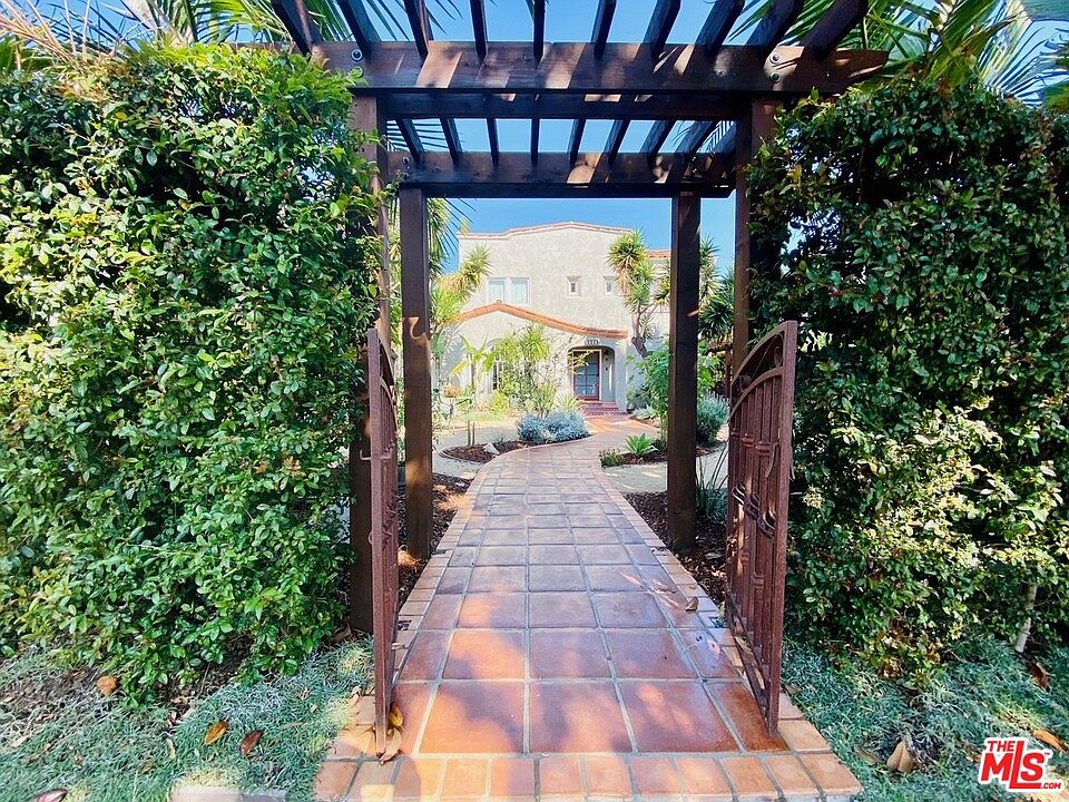 A masterpiece years in the planning and execution, combining historic touches and modern conveniences. Owners are both talented indoor and outdoor designers. Front to back, top to bottom perfection. The charming Spanish features all that makes 1920s craftsmanship so attractive. Beautifully preserved front, arched, floor to ceiling windows and original hardwood floors flow seamlessly with huge modern gourmet kitchen and baths. 3 beds + 1 bath up, 1 en suite bed and full bath down and common 1/2 bath right off the living rm. Wood burning Batchelder fireplace with preserved colored tiles compliment mid-century vibes and designer details. But theres more. Wellington Sq. is semi-gated, closed to traffic on 3 of 4 sides. Great neighbors! Home is located far from main blvd., w no through traffic for quiet private urban living. "Waze proof"! The front "secret garden", hidden from the street by tall landscaping greets guests with a one-of-a-kind garden design of fruit trees and vegetation including avocados, lemons, limes, grapefruit, apricot, banana, yucca, Birds of Paradise and Queen Palms. The back is accessed via the kitchen onto a serene outdoor terrace and pergola covered with vegetation, followed by a peaceful back recreation area incl. covered entertainment bar, BBQ, ping pong, basketball, work area and 1.5 car garage with bonus rm/bath (not incl. in sf)