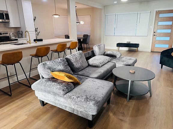 Completely renovated and expertly furnished, this stunning mid century modern home has a breathtaking view of the stratosphere from the back courtyard. This lovely, fully equipped, home, conveniently located near the strip and all the action of up and coming downtown Las Vegas can be yours for a fraction of what you would pay on other platforms. This main house situated next to a totally private guest house (on the side with its own private entrance) that is fenced off. Please do not disturb the tenants. Enjoy large flatscreen TV, fire feature, large, beautiful breakfast bar and central air and heating. Brand new furniture throughout. Priced to rent quickly. Apply today.
