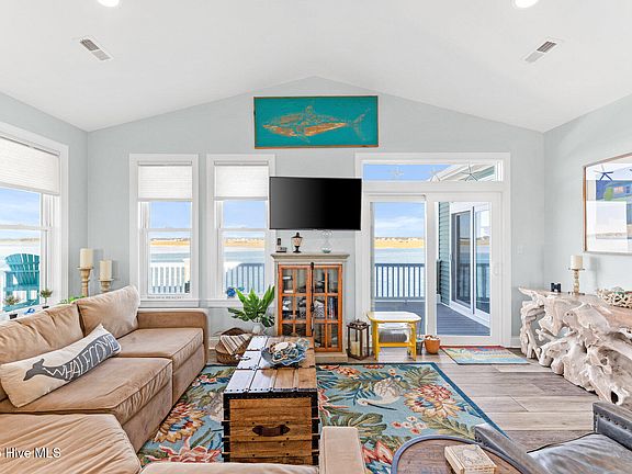 2112 Shoreline Drive in Topsail Beach is a stunning coastal residence that blends modern craftsmanship with the serene beauty of waterfront living. Built in 2018, this 4-bedroom, 3.5 bathroom home is set on a 0.15-acre lot and offers approximately 2,600 square feet of thoughtfully designed living space and is offered tastefully furnished. The homeʼs light-filled open floor plan centers around expansive windows that capture panoramic views of the Intracoastal Waterway, the sound and our island treasure.......''The Point'' conservation area. The main living area flows effortlessly into a gourmet kitchen outfitted with solid-surface countertops, custom cabinetry, and high-end stainless steel appliances — ideal for entertaining or relaxed beachside living. Spacious bedrooms and spa-inspired baths feature coastal finishes and neutral tones that create a tranquil retreat for residents and guests alike. Set on a deep-water lot approximately 65 feet wide, the property provides direct boating access to the sound with breathtaking sunset vistas over the water. Expansive decks and a screened porch offer multiple outdoor seating areas designed for relaxation or entertaining while enjoying the refreshing coastal breeze. The homeʼs well-elevated position offers both aesthetic and practical advantages for waterfront living. A garage is plenty large for parking your car or toys and has abundant storage. Nestled in the desirable South Topsail area, this property combines privacy with proximity to Topsail Beachʼs beloved local restaurants, charming shops, and miles of pristine shoreline. You will enjoy access to boating, fishing, and kayaking right from the backyard while being only minutes to grocery and other shopping needs and a short drive to Wilmington and the airport. Luxury waterfront living awaits.