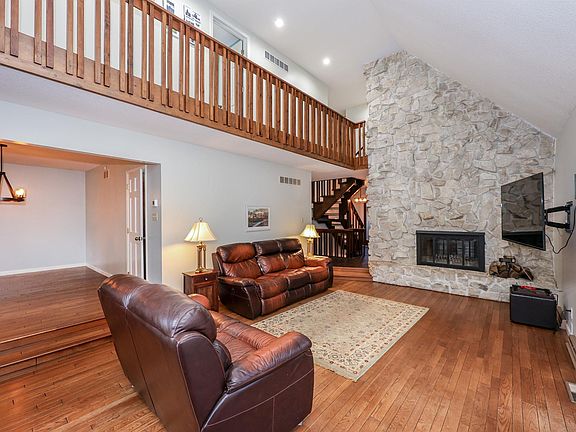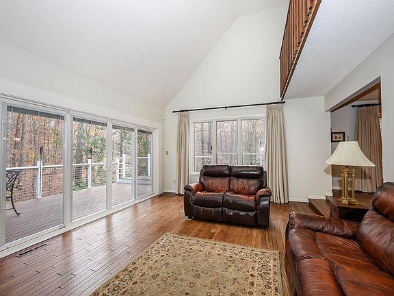 The peacefulness you will feel when driving up to this home is priceless! It is located on 1.66 acres of mature trees, with a ravine that runs on the backside of the property. This custom built two-story home with finished daylight basement boasts over 3100 square feet of warmth, with a floor to ceiling stone, wood-burning fireplace located in the Great Room, as well as one in the Family Room for entertaining or relaxing. The generous kitchen has been updated with new Quartz countertops, soft close drawers, sink, dishwasher, gas range and more. When viewing this home, you will surely appreciate the abundance of windows and extended sliding glass doors throughout, that capture the outdoor scenery. Upstairs, you will find three bedrooms and two full baths. There is also a main floor den, that can be used as a fourth bedroom, if needed. The primary en-suite upstairs has been updated with a frameless walk-in shower, flooring, and quartz vanity counter. The walk-out finished basement is huge and functions perfect for gatherings or recreational space. The laundry room has a new utility sink and folding counter. On the backside of the home, there is a large Trex deck with cable railing showcasing the beautiful and private backyard area. Updates to note are the deck, railing, front stoop, front door, garage doors, kitchen range and counters, 18-gauge metal roof in 2015, LVP flooring, sliding doors, water softener and filtration system and more!