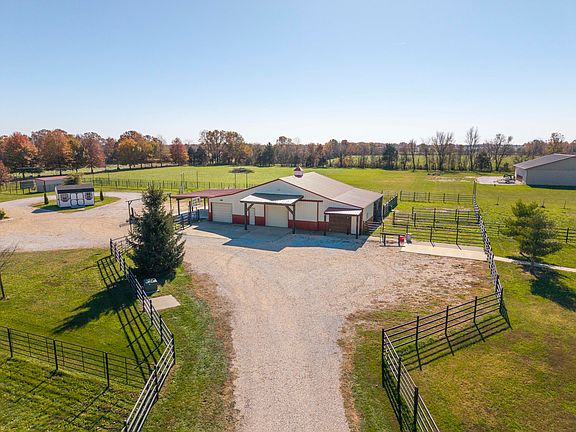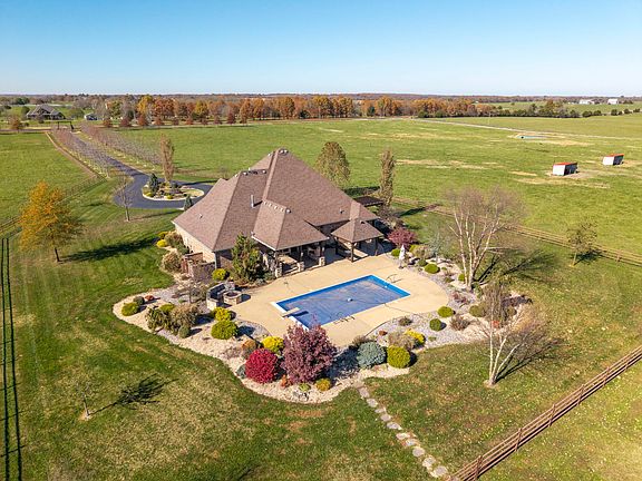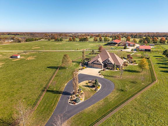 2112 State Highway 413, Billings, MO. - Experience the best of country luxury on this breathtaking 31 m/l acre property just south of Billings. Built in 2014, this 3 bedroom, 3 bath home combines upscale comfort with rustic elegance. A beautiful 600 foot, tree-lined driveway welcomes you home. Inside, soaring ceilings with solid wood beams, custom knotty alder cabinetry, hammered copper farmhouse sink, dry-stacked stone accents, and gleaming hardwood floors create a warm, high-end aesthetic. The primary suite is both cozy and extravagant, featuring a spa-like bath with an oversized walk-in shower, soaking tub, and a spacious closet that doubles as a dressing room. Vaulted wood ceilings and a private patio with a gas firepit make this the ultimate retreat. Outdoor living shines here. Enjoy gorgeous views of the property from the living room, then step outside to your private oasis. The pool area features an outdoor kitchen, a double-sided fireplace, a separate gas firepit, and immaculate landscaping - perfect for entertaining or relaxing in style. This property includes four exceptional structures, each offering versatility and opportunity. 60x64 Shop is spray-foam insulated, with concrete floors, large front and back overhead doors, an office, garage space, loft storage, and an air-conditioned room. Outdoor stalls add even more functionality. 60x40 barn with living quarters is spray-foam insulated with a pellet stove, concrete floors and half bath in large loft plus 20x60 covered area. The barn also offers a complete apartment which includes a full kitchen, living/dining area, bedroom, full bath, and bonus room - perfect for guests. An attached 12'x8' storm shelter provides peace of mind. 60x160 open air covered arena is ideal for equestrian or event use. 12x16 She Shed - A charming addition for hobbies or relaxation. The property is fully fenced and divided into four smaller pastures, ideal for livestock with 3 lean-tos and pond.