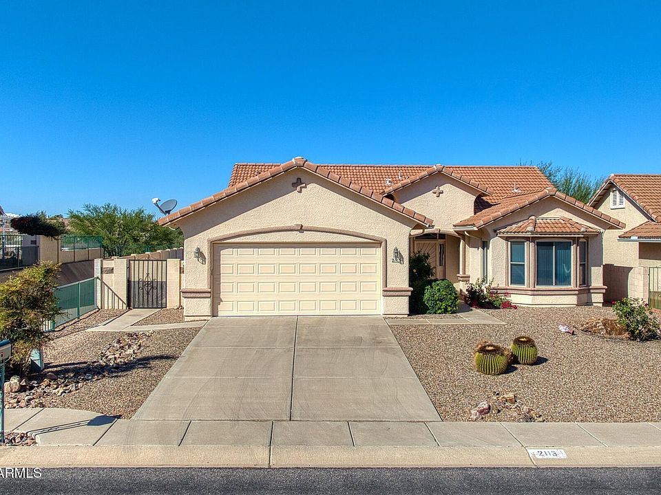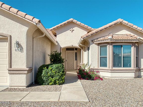 This expanded Brookhaven plan just might be what you've been looking for. This beautiful and upgraded home features a split 2 bedroom plan with 2 baths, a large living and dining space as well as a much larger primary bedroom. You'll find loads of tile with laminate in the 2 bedrooms. The home also sits on the wash so you have no one behind you and awesome views with a great patio to sit out and enjoy the wonderful Arizona weather. You'll also find a spacious laundry room and a 2 car attached garage that features a deep sink along with a water softener. The gated, age restricted community features 2 rec centers along with 2 pools, gathering space and exercise equipment. There are sidewalks all around to walk the community. You won't want to miss this one.