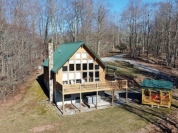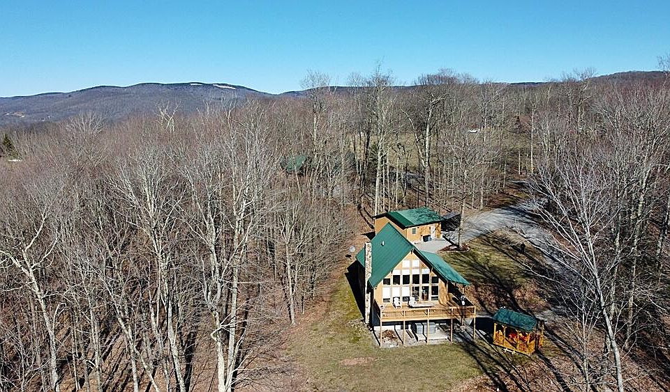 Soaring Eagle II is a 4 bed/3 bath cabin in the hills of the Slatyridge neighborhood, just 6 miles away from Snowshoe Resort on 10.56 acres. Relax on the recently refinished 1,000sq/ft deck with a grill, or take a dip in the hot tub below. 2 bedrooms and bath on main level, master bedroom with full bath in loft, bedroom, bath and den downstairs. Relax and enjoy the wall of windows with great views, get the fire going in the custom designed soapstone fireplace imported from Sweden. Property has large 2-car garage, fire pit, hot tub, gazebo, big views. All furnishings, artwork and appliances convey to new owner. Very successful AirBnB rental. 2,376 sq/ft