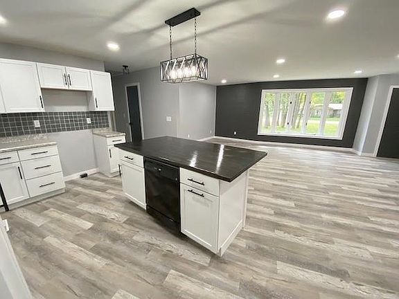 PERFECT LOCATION, WONDERFUL OPEN FLOOR PLAN! Walls have been removed, lighting updated, painting fresh, flooring has been replaced, new kitchen cabinets , farmer sink and faucet. Plus a beautiful stained butcher block top on the spacious island. Three bedrooms, two full and 1 half baths. Large oversized two car garage for the vehicles and another room that offers even more storage. Exit thru the sliders (2019) to the wood deck and small area of the yard that is fenced. Feels like country but its not!