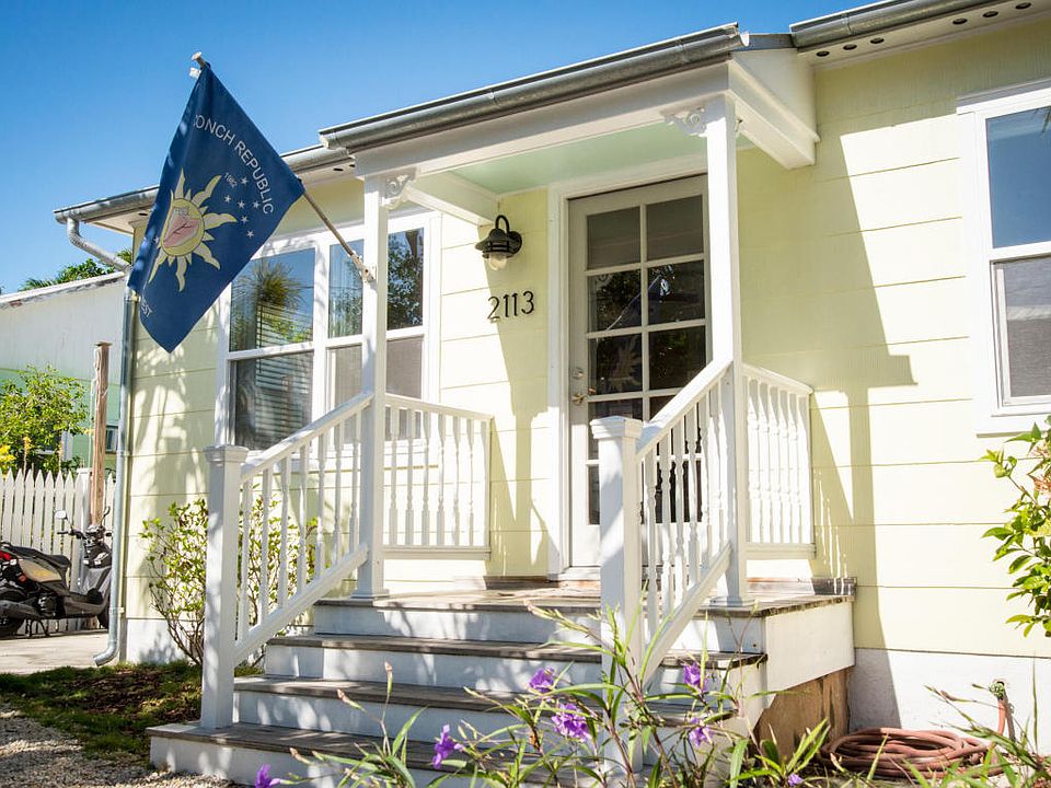 The beauty of this home is the rear of the property. The brick walkways open to a covered outdoor entertaining area with kitchen. This home with rear cottage doesn't seem to need any upgrades. Nice landscaping had very minimal damage from Irma. Floors appear to be original wood refinished to shine. Master bedroom has an entire wall of built-in storage. Windows are now impact, great for insurance. Central AC, very nice kitchen, attic access, metal roof, tented in 2017. Outdoor shower and enclosed storage too! Guests are treated to a private room with tile floors, full bath, walk-in closet. Utility easement behind lot is maintained and accessed thru rear gate.