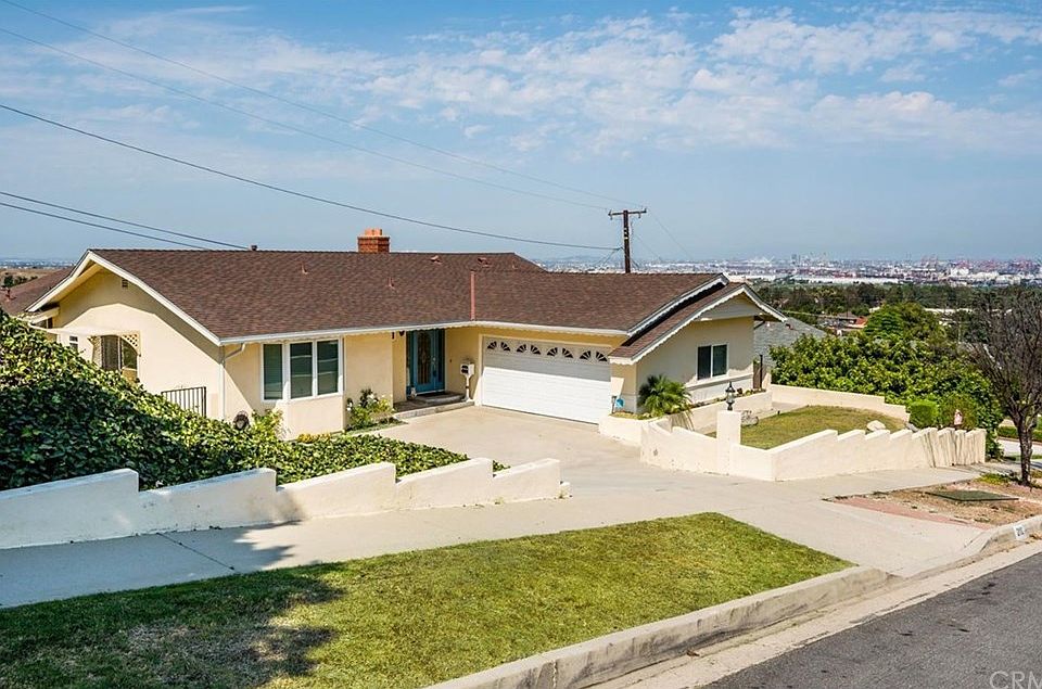 Spectacular setting with Panoramic views of the Harbor, City, Mountains, Downtown L.A. and beyond! Terrific location with easy access to Downtown Los Angeles, the westside, over the bridges or to the beach. Best of all, take advantage of the unequaled Palos Verdes schools! You must see this gorgeous home with open floor plan and great indoor and outdoor living spaces. The Master suite with vaulted ceiling, custom draperies, ceiling fan, huge walk-in closet with organizer and remodeled bath. All baths are remodeled with travertine and tile, marble sinks and counters. The fully remodeled kitchen with charming dining nook also features a breakfast bar and custom built-ins. Stainless stove and fridge also included! Hardwood floors, gas/wood burning fireplace in the living room and an attached 2 car garage with more built-ins and a custom work bench. Great outdoor living area to take in the spectacular views!!
