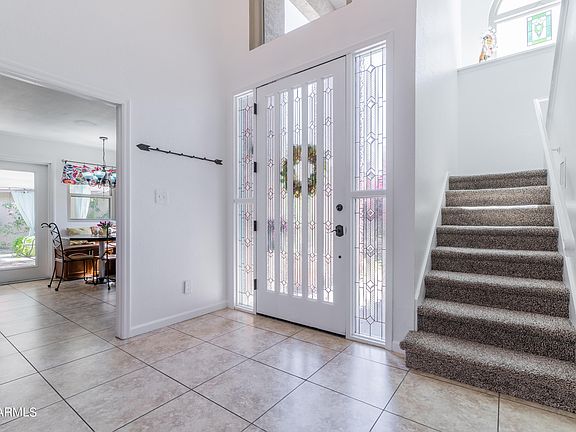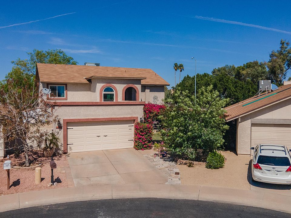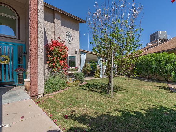 Stunning Dobson Ranch home~ 4 bedrooms, 2.5 Baths, cul de sac lot. Big eat in kitchen with breakfast bar. Custom gate and front door, extended covered patio with tile. Apricot, nectarine & plum trees, mature vegetation, multiple rain catching Totes, atrium, wet bar, vaulted entry, 1 bed down & 3 upstairs~ Primary bedroom with sitting area + Fireplace! Another fireplace in Great room. Impeccably maintained. All in Dobson Ranch with lake, pickleball, tennis, basketball, walking paths, fitness facility, and an active community center. A host of clubs from gardening to hiking and everything in between. Within the last couple years sellers have: added Radiant heat barrier, 4-6'' insulation in attic, replaced most of downstairs windows and pation doors to be energy efficient, added pressure valve and plumbed water heater with new drainage plumbing. AC has been remounted and serviced for efficiency, $15,000+ in landscaping, removed popcorn ceiling and added recessed lighting throughout downstairs, updated nearly all light fixtures, Added storage units, 4 rain totes, and the atrium door. Access door from Garage to backyard was also added, and block wall was built up and stuccod. Home is great for entertaining and location is easy access to neighborhood Lake as well as area freeways.