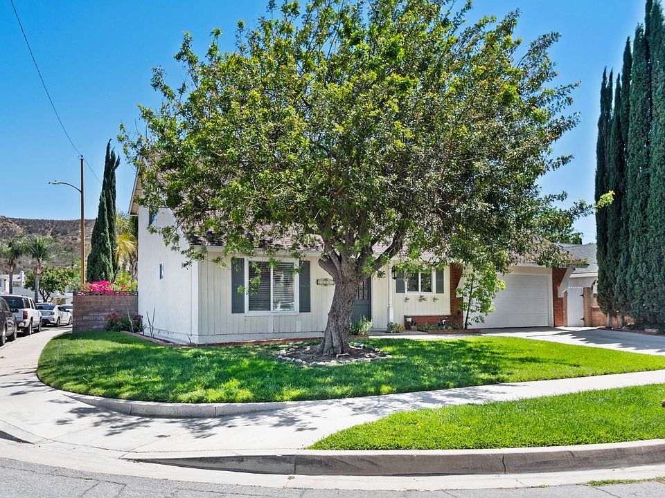 Nestled in Bouquet Canyon resides a very charming home featuring 4 bedrooms and 2 bathrooms. This is a corner lot property with lots of curb appeal, charm and even a picturesque exterior too that includes new grass! The open floor-plan consists of 1,604-SqFt of living space and a double door entry into the home. Inside features new hardwood flooring with baseboard moldings, along with high ceilings, recessed lighting, and a fireplace in the living room! There is an open airy kitchen that is equipped with granite countertops, a decorative subway tiled backsplash, stainless steel appliances and even a breakfast bar. Bathrooms have plenty of storage space and a beautiful vanity sink. Bedrooms are bright and spacious, offering ample closet space. The bedrooms each have a nice window view of the nearby mountains. The first floor has 1 bedroom and 1 guest bathroom. The second floor has 3 bedrooms and 1 bathroom. Outdoor you are greeted with an open private back yard that has a sparkling, new plastered pool, plus a covered patio where you can add outdoor seating. There is plenty of space where you can relax or entertain. The property has a large 2 car garage with a laundry area inside, as well as a new sprinkler system. Located in a Prime Saugus location, close to award winning schools!