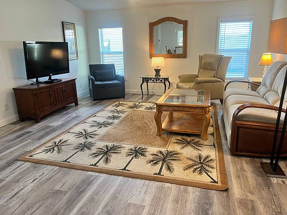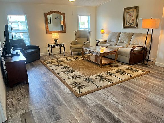 This beautifully updated 2-bedroom, 2-bath home is in the highly desirable 55+ golf cart-friendly community of La Costa Village, just 6 miles from the beach! Enjoy a relaxed, coastal lifestyle with modern comforts and resort-style amenities right at your doorstep. Step inside to find a bright, open floor plan featuring new windows, vinyl plank flooring throughout, and new appliances. The upgraded kitchen offers granite countertops, gray shaker cabinets, a deep stainless-steel sink, and a convenient pass-through to the den, making entertaining effortless. A separate dining room provides the perfect space for hosting meals with family and friends. The oversized primary suite includes a walk-in closet and private bath with a walk-in shower and updated plumbing. The guest bedroom and hall bath are spacious and beautifully finished, offering comfort for visitors. Additional updates include a new hot water tank, indoor washer and dryer, and a spacious storage workshop perfect for tools, hobbies, or beach gear. Enjoy your morning coffee on the screened-in patio or soak up the sunshine on your outdoor patio. This lovely home will be partially furnished, so you can move right in and start enjoying Florida living! La Costa Village offers incredible amenities, including two swimming pools, a clubhouse, pickleball courts, lawn care and irrigation included, and a pet-friendly atmosphere. Come see why La Costa Village is one of the most sought-after 55+ communities in the area-where friendly neighbors, palm trees, and endless activities make every day feel like vacation!