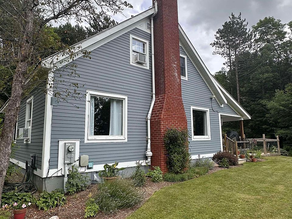Almost four acresBabbling streamOverlooks a pondSecluded roadCovered porchHardwood floorsCarpeting in the bedrooms