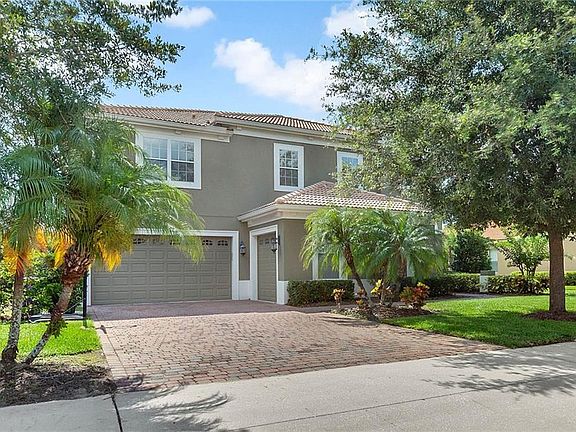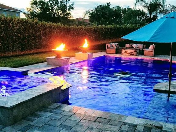 Volume ceilings & wrought iron stair railing. 5th Bedroom downstairs with full bath. Large upstairs loft with wet bar. Mstr bdrm is upstairs w dbl entry door & tray ceiling, custom window bay, his/her closet. Mstr bath with garden tub, separate shower &his/hers granite counter vanities. Breakfast bar in the kitchen is open to the family room. Kitchen has beautiful wood cabinetry, solid surface counters and a center island. Covered porch with pavers and speakers. Backyard is fenced and lines with tall Hedges. Huge Solar Heated Pool (not your standard Florida pool size 30x15) and heated Spa. Propane fire bowls illuminate the backyard. Granite Fire Pit, Outdoor Speakers, Double Crown Molding throughout the house, Tinted Windows, Tile on first floor and Wooden floors on 2nd. Rock Wall accent wall in living room. Plank wall in the game room with surround sound
