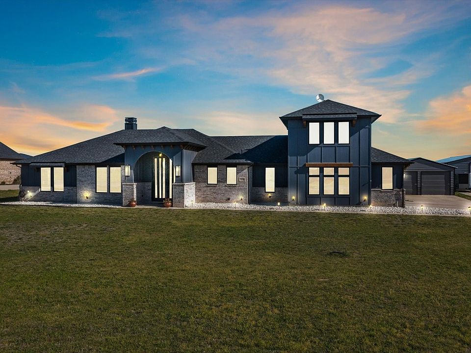 This truly stunning custom mid-century modern home is located on a 2.01 acre lot and boasts an impressive list of features that will make you fall in love. As you approach the property, you'll be struck by the stunning curb appeal, highlighted by the Custom Double 7x10 Iron doors that lead into the entryway. Open-concept floor plan with luxury finishes throughout. The first floor features all the bedrooms, including the primary suite with an impressive bathroom & walk-in closet with direct access to the mud room & laundry room.Upstairs is the bonus entertainment room! There's even a butler's pantry & mud room to help keep everything organized and tidy. Outside, appreciate the workshop with electricity available & two roll-up garages attached, a swimming pool with a water feature, spa, & a large covered patio. Making it the perfect place to entertain guests or relax on a warm summer day. Including 3 entrances to the backyard, one that leads directly to the guest quarters bathroom.