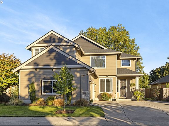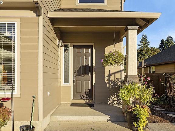 Be the second proud owner of this beautifully maintained, truly immaculate home that shines inside and out. Step into soaring ceilings and a seamless flow between formal and informal living spaces, perfect for everyday living and entertaining. The kitchen features Hickory cabinets, while the inviting great room centers around a stone gas fireplace, creating a warm and welcoming focal point. Luxury vinyl plank flooring extends through the main level and primary bedroom, combining style with durability. A main-level bedroom with an attached full bath is ideal for guests or multi-generational living. Upstairs, discover four additional bedrooms — or transform one into a spacious bonus room to fit your lifestyle. Outside, enjoy a beautifully landscaped, private yard featuring an attached tool shed (with power), a sprinkler system, raised garden beds, and mature trees that provide shade and charm. Major updates include a new roof (2021) and replacement double-pane glass (glass only, not frames) installed under warranty by the original manufacturer. The extended garage offers a convenient side-access door and extra space for storage or hobbies. All this in a prime location near a dog park, shopping, top-rated schools, major commute routes, and just 20 minutes to PDX.