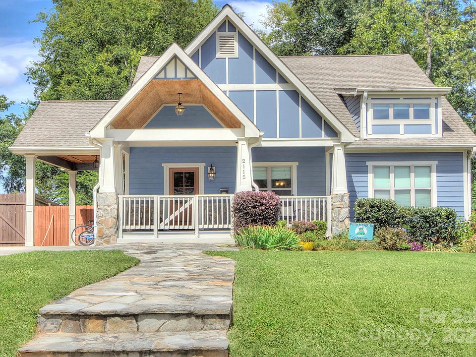 Discover this beautifully designed Craftsman-style home in the heart of Villa Heights, one of Charlotte’s most sought-after infill neighborhoods. Originally built in 2015 on original foundation this home was thoughtfully expanded with a 1,300 sq. ft. addition in 2018. This home now offers generous living spaces including a spacious family room on the main level and a private lower-level suite with bedroom, en-suite bath, and walk-in closet—ideal for guests or multi-generational living. Step inside to find a light-filled interior with vaulted ceilings, abundant windows, and a modern open layout. The kitchen is a true centerpiece, featuring white cabinetry, granite countertops, a gray subway tile backsplash, stainless steel appliances including gas range and refrigerator, center island with prep sink, breakfast bar, and walk-in pantry—perfect for both everyday living and entertaining.