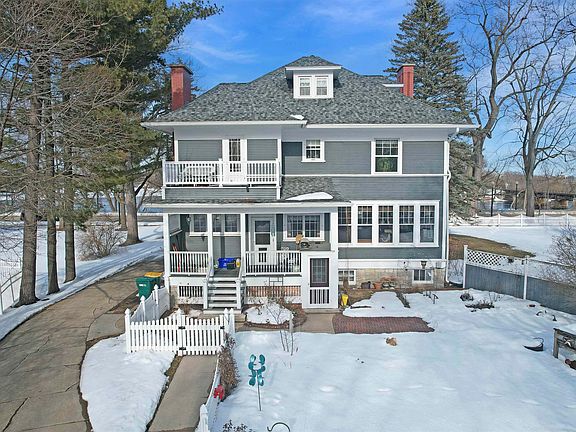 AMERICAN FOURSQUARE STYLE HOME w/5 bedrooms & 3 baths with over 225' of Menominee River Frontage in the City of Marinette. Home is bright and cheery with a large inviting front porch. 1 gas fireplace in Livingroom. Beautiful flooring throughout recently updated, original woodwork & crown molding, freshly painted interior, French Doors, Butler's Pantry, updated light fixtures and a modern kitchen with breakfast nook. 200 amp electrical service, new roof shingles in 2020. Tiled Shower in primary bathroom, central air plus the lower level offers a movie room w/painted concrete floor, cheery laundry area, newly added bath with shower plus lots of storage & all new basement windows. Carpeting on the 3rd level just replaced. There is a firepit by the river to enjoy the picturesque views.