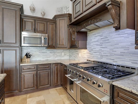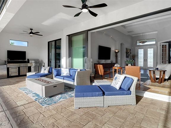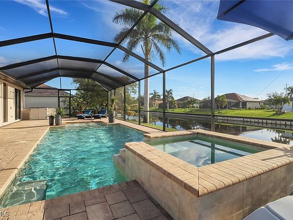 Waterfront 3 bedroom + den, 2 bath home on the McDonough Freshwater Canal with 3-car garage. Located in one of the prettiest parts of SW Cape Coral, this home features impact doors and windows, 90-degree 8’ impact POCKETING sliders, and a motorized Kevlar lanai screen. Interior highlights include travertine floors, coffered ceilings with crown molding, Bose sound system, and a chef’s kitchen with oversized Jenn-Air commercial gas range with griddle, full-size (double door) refrigerator and freezer, and a huge kitchen island. Plenty of custom cabinets for storage and decorative glass back splash. The primary suite offers a walk-in shower with overhead rain shower and an air-jet soaking tub, dual vanities, over-sized hers and his closets with upgraded hardwood shelving. Outdoor living includes an over sized under truss lanai, heated saltwater pool with spillover spa and sun shelf, outdoor kitchen, and a screened lanai. The guest bath doubles as a pool bath for convenience. Additional upgrades: flat tile roof, fenced backyard, and circular pavered driveway, mature tropical landscaping. Convenient to Surfside shopping, dining, and Veterans Pkwy. LOW transferable Flood Policy.
