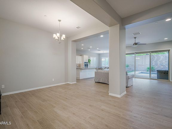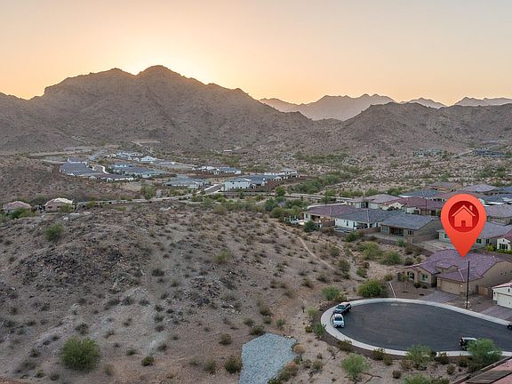 Located on a premium cul-de-sac lot siding natural open desert with walking trails, this original-owner home features 4 bedrooms & 3.5 baths in 2738 SqFt with an open great room layout and split bedrooms. The gourmet kitchen will delight the home chef as it features an abundance of white soft-close cabinetry with under cabinet lighting, GE CAFE appliances including a gas cooktop, double wall ovens plus a built-in microwave, quartz countertops, subway tile backsplash, a large walk-in pantry, and an island with breakfast bar. Sliding glass doors from the casual dining area and the great room lead out to the covered patio with paver floor, and a sparkling self-cleaning pebble tec pool with a water feature, large Baja step, and wiring for a heat pump. The backyard also has grass for kids and pets to play on, a raised planter bed/retaining wall, and mountain views. The primary bedroom has an en-suite bath with a dual sink vanity, walk-in tiled shower, and a walk-in closet. One secondary bedroom also has an en-suite bath, perfect for overnight guests! Two additional secondary bedrooms have walk-in closets and share a full bath with double sinks and a tub/shower combo. Other features include a spacious laundry room, plantation shutters throughout, neutral two-tone paint, powder room for guests, stone exterior elevation, and a 3-car tandem garage with a paver driveway and RV gate. Community amenities include a resort-style pool and spa, clubhouse, hiking trails, and playgrounds, along with convenient access to Verrado shopping and dining and easy access to I-10 and Loop 303.
