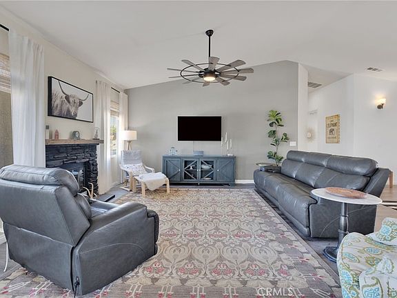 The open floor plan balances shared spaces & privacy. Vaulted ceilings and abundant windows fill the home with natural light. The upgraded kitchen includes white cabinetry, pantry, Professional stainless appliances (refrigerator negotiable), 6 burner stovetop with convection/air fryer steam oven, Gorgeous Carrera Marble countertops and backsplash, and recessed lighting. At its center is a full-size custom island crafted of black wrought iron and matching Carrera Marble (negotiable). The kitchen opens to a breakfast nook with a bay window, and a spacious great room with a cozy stacked-stone fireplace, custom ceiling fan, and adjoining living room—perfect for everyday living & entertaining.
