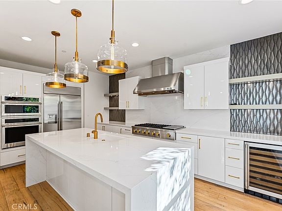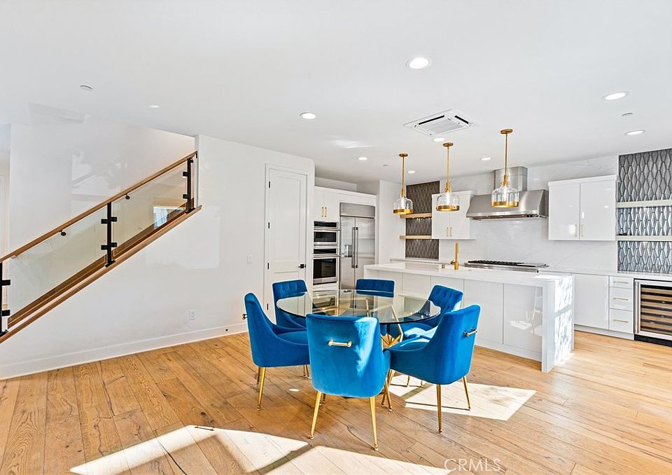 The chef's kitchen is the heart of the home, featuring high-end appliances, a generous center island, custom cabinetry, and custom backsplash and fixtures.