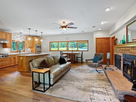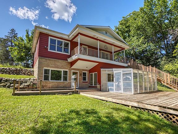 Exceptional 4BR ranch home with finished walk-out lower level on over 2.23 private acres in Delafield! Enjoy this beautiful wooded setting. Home offers many recent updates throughout. Gorgeous renovated kitchen features large quartz breakfast bar island, hickory cabinets, and SS appliances included. Fireplaces in the main level great room and lower family room. 3 BR's and full bath on main level. Lower level is a full walkout and offers a family room, sun room, 4th bedroom, and full bath. Relax outside on the upper deck, covered balcony, lower deck, or in the 3-season room-greenhouse. Recent years updates include the garage doors, well pump, lighting, flooring, and much more. Kettle Moraine School District, Great tucked away location yet close to all the conveniences!