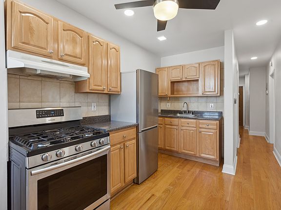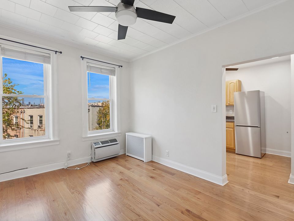 We are proud to present for rent a large 1BR located at 21-17 Rene CT, a historic three-family townhouse on a picturesque block in the desirable neighborhood of Ridgewood, Queens. Only a 30 minute commute to Downtown Manhattan on 14th and 1st Avenue! As you enter the home, you are greeted by a bright living room illuminated by western exposures with gorgeous Manhattan skyline views as well tree-tops and sky! The living room has two (2) oversized windows. Every room in the home has windows that create an airy atmosphere. The space comfortably accommodates a couch, media station, and home office. The bedroom can accommodate a queen-sized bed, end tables, and a boudoir. The large windowed eat-in kitchen is renovated with a full-size range with a vented hood, refrigerator, tiled backsplash, and a dining table. The bathroom is fully renovated with modern marbled tile throughout and features a window, a soaking tub, Kohler finishes, a vanity, and built-in fixtures for extra storage. The home features an XL walk-in closet, 9 ft ceilings, hardwood floors, through-wall air conditioners, steam heat, and a new video intercom system. 21-17 Rene CT is conveniently situated in an idyllic and neighborly block of Ridgewood that is both close to the action and an escape from the hustle and bustle of city life. Grover Cleveland Playground and Grover Cleveland Highschool are right around the corner, as well as plentiful hip shops, restaurants, cafes, and delis. Easily walk over to enjoy the renowned nightlife, bars, restaurants, and more - of bordering Bushwick and Williamsburg! Public transportation abound - the L subway line on Dekalb Avenue or Jefferson; the M subway line at Seneca Avenue or Forest Avenue; and Q54 and Q38 on Metropolitan Avenue. Best of all, the Citibike Station is located on the same block as the home! Book your private tour of 21-17 Rene CT today!