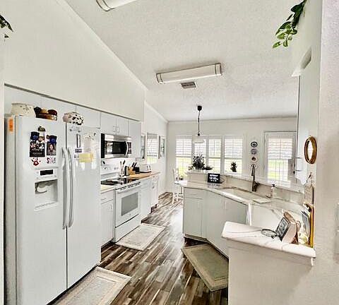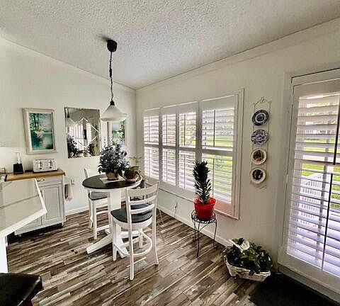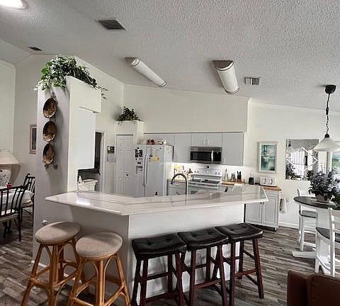 This turnkey two-bedroom, two-bath villa offers an inviting open floor plan with high ceilings, beautiful vinyl flooring, plantation shutters, a solar tube for added light, and a large dining room open to the great room, perfect for entertaining guests. The kitchen is a chef's delight, featuring updated quartz counters, under-counter lighting, modern appliances, a pantry, and an inside laundry area with cabinets and a stainless steel sink. Step outside to the spacious open patio, ideal for relaxing or entertaining. The bedrooms are generously sized, with the primary suite boasting double sinks with quartz counters, two walk-in closets, and a large walk-in shower. The guest bath also has updated counters. Located in Timber Pines, this villa grants access to numerous amenities, including two large community pools, a state-of-the-art fitness center, new pickleball courts, a clubhouse, restaurant, bar, lodge, library, shuffleboard, bocce ball, Har-Tru tennis courts, billiards, a performing arts center, and crafts facilities like a pottery studio and woodworking shop. Residents can also enjoy various social clubs and activities, such as card clubs, mahjong, and water aerobics. For added peace of mind, Timber Pines features three manned guard gates. Golf enthusiasts will appreciate the three 18-hole golf courses, a 9-hole walking course, two pro shops, practice greens, and a driving range. High-speed cable and internet are included with the HOA. This villa is ready for you to move in and start enjoying the unparalleled lifestyle Timber Pines offers. Don't miss the opportunity to make this beautiful villa your new home!