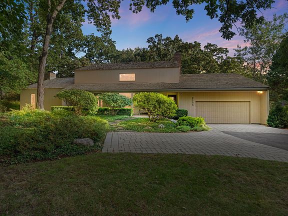 Two fireplacesMid century modern feelBuilt in bookcasesPartially finished basementPicturesque viewBeamed ceilingsPrivate wooded lot