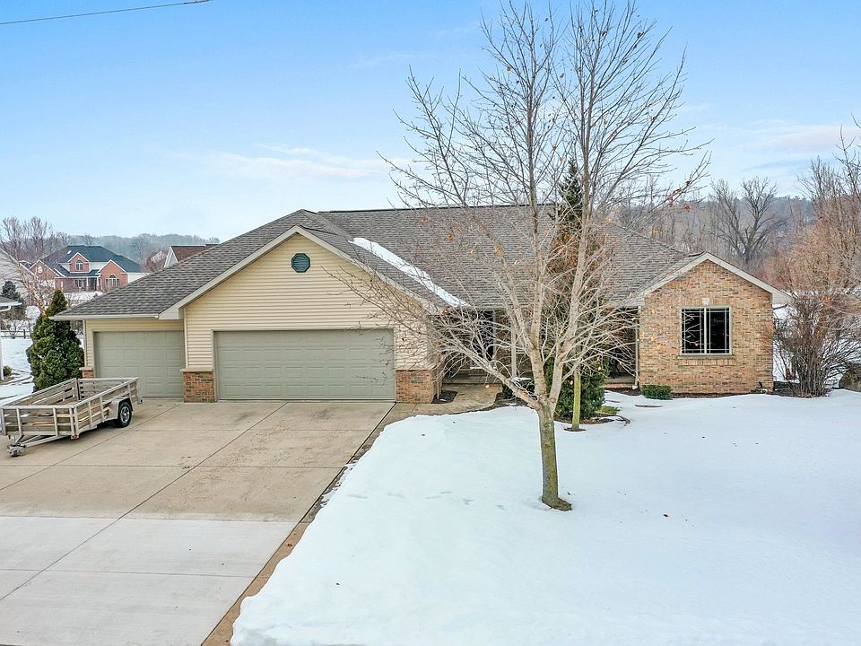 Beautiful Ledgeview ranch home featuring 3 bedrooms & 3 full baths. 2x6 construction, 6-panel doors, maple trim & cabinets & cathedral ceilings in living room. Professionally landscaped yard with stamped concrete back patio. Finished lower level with bar, gas fireplace, full bath, sauna & mud room. Extra-large 3-stall garage with epoxy floors, ceiling fans & stairs to the lower level. New roof 2022. Pergola & firepit on back patio which overlook a Conservancy. **Some photos virtually staged**
