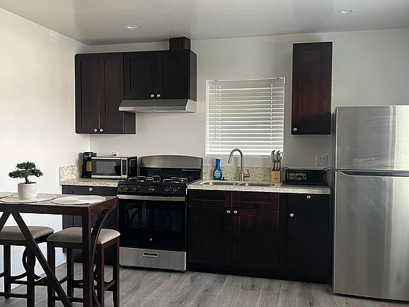 This unit features an open floor plan, appliances are included: stainless steel stove and refrigerator it also has a washer and dryer hook up, dark cabinets and laminate flooring throughout the unit.
