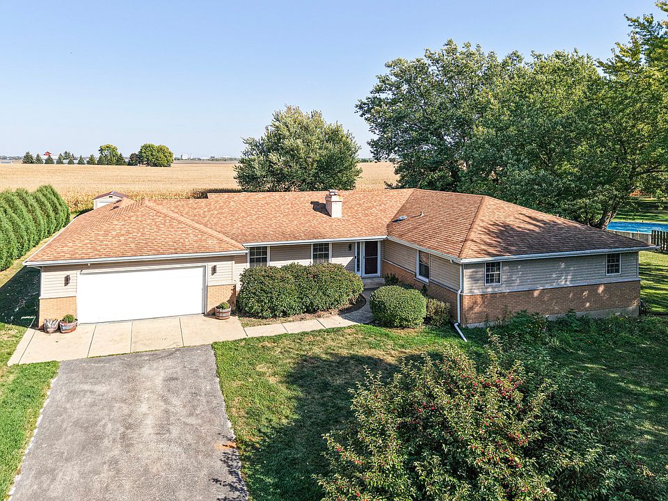 Welcome Home and enjoy the tranquility of this COUNTRY RANCH situated on a.72 acre lot that backs up to a corn field. Enjoy the sunsets from the recently new deck or from the front porch. Enter this three bedroom, 2.5 bath home through the large foyer off the sunken living room with new carpet and a wood burning fireplace. Eat in kitchen with separate dining room overlooking the 3/4 acre back yard with shed. Office/den, powder room of the 1st floor laundry. 3 seasons sun room with bar for entertaining. Pegged hardwood floors in the bedrooms and under carpet in family room with new carpet. Large primary with jaccuzi tub, separate shower and skylight. Oversized 2 car garage. Basement with a newly lined crawl. Enjoy peaceful living and a bit of the country yet close to town with all the amenities. Updates: carpet 2025, deck 2025, powder room, epoxy garage floor, 2 new basement windows, lined the crawl space, stove and dishwasher in 2025, refrigerator in 2024, 2014 roof, furnace and blower in 2014, primary skylight in 2023.