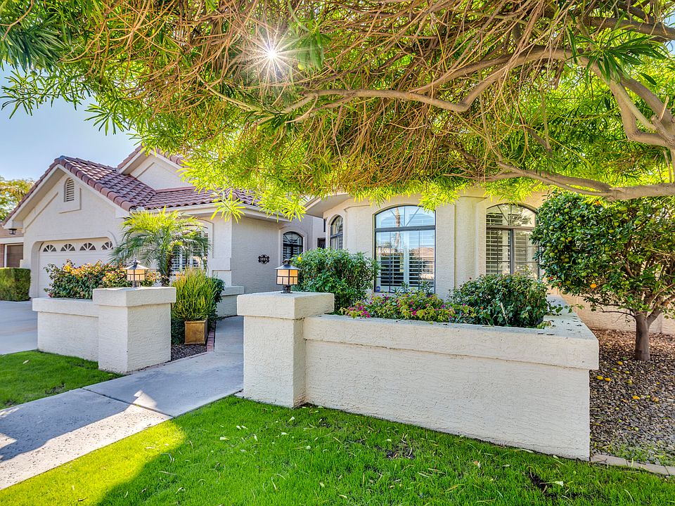 CUSTOM Single-level water front home in Val Vista Lakes gated Regatta subdivision. You will fall in love with this community and the lakes lifestyle! Private street at the end of a quiet cul-de-sac with additional parking in the center court. Single level living with open floorplan for easy entertaining! Large master bedroom with outdoor access to the hot tub on the private patio. Two bedrooms with a shared Jack-n-Jill bathroom. Large space for home office. Third bay of garage has been converted for living space. Possible workroom/office or can easily be converted back to garage. (Ask about details) North south facing with large patio stubbed for gas outdoor kitchen. Outdoor fireplace adjacent to hot tub for romantic evenings under the stars! Newer carpeting and paint. Wood flooring. Convenient to US 60 & Dana Park shopping & dining. Excellent Gilbert Schools. Near Gateway airport and 20 minutes to Sky Harbor International. You are a short bike ride away from downtown Gilbert restaurants and Hale theatre. Such an ideal location. Call to schedule an appointment today!