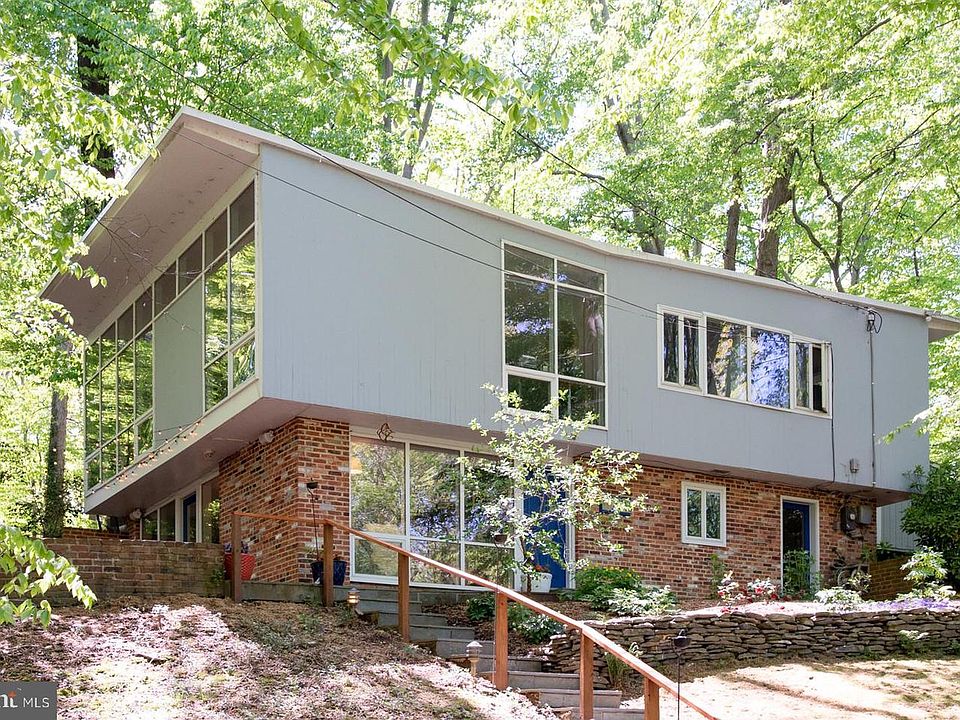 Beautiful two level Mid-century modern home with four bedrooms and three full baths has rare butterfly roofline in Hollin Hills, designed by Charles Goodman. Over 2300 square feet of living space on large .55 acre lot. Floor to ceiling double pane windows overlook parkland with tree-top views. Main level family room with wood-burning brick fireplace. Remodeled kitchen with updated cabinetry, new five burner cooktop, double oven, granite countertops and separate dining room. Upper level living room with vaulted ceilings, second wood-burning brick fireplace, custom built-ins with glass door to private slate patio. Master bedroom with en suite bathroom with garden views.Two additional bedrooms and full bath on this level. Fourth bedroom with third full bath makes wonderful light-filled office or In-law suite.Extensive landscaping includes walls, stoned steps and walkway, new railing, lighting and brick patio. A gardeners paradise. Don't miss large storage shed.